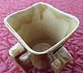 Usually made of woods such as crab apple, alder, willow, sycamore, etc.[5] with a four side top and oval or circular bottom. Methers have a number of handles, placed at the foot of the vessel and sometimes extending below the handle bottom to form feet as well as serving as handles.[6] The actual number of these handles varies from one to four and the vessel itself varies from 6 to 12 inches (15 cm to 30 cm) in height with a capacity of from one to three pints.[6] The multiple handles would make it easier to pass from one person to the next.