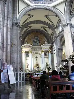 The Altar of Forgiveness (Spanish: Altar del perdón) is located at the front of the central nave. It is the first aspect of the interior that is seen upon entering the cathedral. It was the work of Spanish architect Jerónimo de Balbás, and represents the first use of the estípite column (an inverted triangle-shaped pilaster) in the Americas.[3]