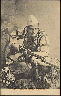 Milan Aleksić (Serbian Cyrillic: Милан Алексић), nicknamed Miša (Миша), known by his nom de guerre Marinko (Маринко), was a Serbian Chetnik active from 1905 to 1918.[1] He was born in Raška, at the time part of the Ottoman Empire.[1] He fled Ottoman tyranny to Kuršumlija, in the Kingdom of Serbia,[1] where he graduated from the Military Academy as a non-commissioned officer.[2] He joined the Serbian Chetnik Organization in 1905, fighting under Jovan Babunski and Gligor Sokolović in Poreč and on the Babuna against Bulgarian and Albanian bands.[1] He was an assistant of the Upper Staff of Panta Radosavljević-Dunavski, Nikola Janković-Kosovski and Pavle Blažarić as a non-commissioned officer. In 1908, he worked with Vojislav Tankosić in training volunteers in Bosnia.[1] He is regarded a hero in all wars between 1912 and 1918, during which he had the rank of lieutenant colonel.[1] He died of exhaustion in Veliki Bečkerek (modern Zrenjanin), in Banat, on May 27, 1923.[1]