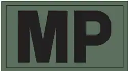 In the U.S. Army, a simple patch with the legend "MP" worn on the left arm distinguishes a military-police soldier wearing the Army Combat Uniform (ACU). This patch is attached to the uniform by a hook and loop fastener (i.e. Velcro). For both garrison law-enforcement duty as well as for tactical field work, the patch is a subdued brown with black lettering.