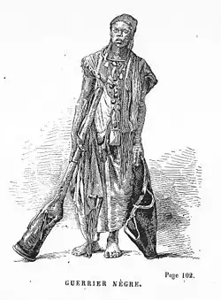 The dress of the captains was a war cap, with gilded ram horns projecting in front, the sides extended beyond all proportion by immense plumes of eagle feathers, and fastened under the chin with bands of cowries. Their vest was of red cloth, covered with fetishes and saphies in gold and silver; and embroidered cases of almost every colour, which flapped against their bodies as they moved, intermixed with small brass bells , the horns and tails of animals, shells and knives; long leopard tails hung down their backs, over a small bow covered with fetishes. They wore loose cotton trousers, with immense boots of dull red leather, coming half way up the thigh, and fastened by small chains to their cartouch or waist belts; these were also ornamented with bells, horse tails, strings of amulets, and innumerable shreds of leather; a small quiver of poisoned arrows hung from their right wrist, and they held a long iron chain between their teeth, with a scrap of Moorish writing affixed to the end of it. A small spear was in their left hands, covered with red cloth and silk tassels; their black countenances heightened the effect of this attire, and completed a figure scarcely human....