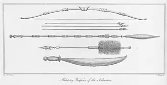 In battle, the army used advanced guard, main body, rear guard and right and left wings on the move. This organization enabled the Asante generals to maneuver their forces with flexibility. Reconnaissance and pursuit operations were carried out by the scouts.[16] The scouts were made up of professional hunters who used their skill of marksmanship to snipe at advancing enemy forces in response to detection by the enemy. This was executed often from a perch high in trees. In order to draw the enemy's force and compel them to reveal their positions in the jungle foliage, the scouts carried long wooden sticks with hooks on the end which they used to shake trees as if someone were in them. Scouts were precluded from an involvement in prolonged fighting. After exchanging a few shots with the enemy, they withdrew through the next wave of troops which was the advanced guards.[17] The advanced guard could also serve as initial storm troops or bait troops to get the enemy to reveal their position and strength. The gyase or personal guards protected the king or high ranking nobles on the battlefield. The rear guard however, might function for pursuit or as a reserve echelon. The two wings aided in the tactics of the Asante during battle through the encirclement of the opposing force or striking at the rear.[16]