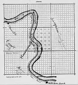 The settlement and the bend in the river were named for Major John Milliken.[2] According to one source, Milliken was "an early settler supposed to have been a member of the pirate band of Captain Bunch" that gave its name to Bunch's Bend (or Bunches Bend).[3] According to a family history, "He studied surveying when a young man, and going to Kentucky with others of the family found employment under the State government, and was rewarded by a grant of land in Louisiana, where he cleared a large and valuable plantation, which was called Milliken's Bend, it being on a loop of the Mississippi River. He owned many slaves, and acquired wealth."[4] Milliken is believed to have made his settlement slightly after 1813.[5] He eventually owned a vast area between Morancy Plantation and Cabin Teele Plantation.[6] Millikin's Settlement was present on Mississippi River guide books intended for use by boat pilots as early as 1827.[7] There is a record in the Madison Parish registers for a slave sale from L. Hyland to John Milliken on July 13, 1832.[8]