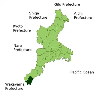 - Kinomoto Town (木本町), Arasaka Village (荒坂村), Atashika Village (新鹿村), Arii Village (有井村), Kamikawa Village (神川村), Isato Village (五郷村), Asuka Village (飛鳥村), Jōsen Village (上川村), Iruka Village (入鹿村), Nishiyama Village (西山村) - (Currently the City of Kumano (熊野市))