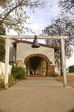 ![]() A view of the Mission San Juan Bautista and its three-bell campanario ("bell wall"). Two of the bells were salvaged by Father Nick Senf in 2009 from the original chime, which was destroyed in the 1906 San Francisco earthquake. | |