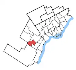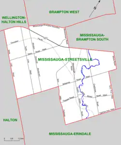 It consists of the part of the City of Mississauga bounded by a line drawn from the northwestern city limit southeast along Mississauga Road, northeast along Highway 401, southeast along Mavis Road, southwest along Britannia Road West, southeast along Terry Fox Way, southwest along Eglinton Avenue West, northwest along Erin Mills Parkway, southwest along Britannia Road West to the western city limit and back northwest.