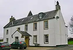 Monkredding's modern form surrounds three sides of a square, open to the north. The west wing and stair-tower are ancient.[8] The west wing bears a date stone '1602 or 1605' in the north gable, whilst the remainder was added in 1638,[9] this date being inscribed on a dormer pediment in the west wall; the lower floor is vaulted. Whitewashed roughcast harling covers the masonry; the roof has been lowered; the circular stair-tower has been significantly raised in height. No dormers are now present and the crow-steps have been removed.[8] The 17th-century building was enlarged and re-orientated in the early 19th century when the principal facade and central entrance were extended south.[10] Monkredding House is B Listed.[11]