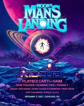 The first Moon Man's Landing event was initially held as a one-day music festival that took place on Saturday, September 17, 2022, as one of the tour dates for Cudi’s To the Moon World Tour.[1] The event was held at the West Bank Flats in Cudi’s hometown of Cleveland, Ohio.[2] The line-up for the festival included musicians such as Don Toliver, Playboi Carti, Haim, Bone Thugs-n-Harmony, Pusha T, Jaden and Chip tha Ripper, among others.[3]