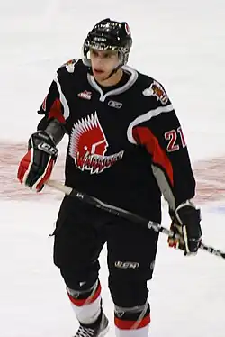 The team's first few seasons in Moose Jaw saw Theoren Fleury emerge as the team's primary star—Fleury finished among the top five scorers in the WHL during his tenure with the team. Led by Fleury, Kelly Buchberger, Mike Keane, and Lyle Odelein, the Warriors made the franchise's first playoff appearance after the relocation during the 1985–86 season.[3] The team captured its first regular season division title in 2003–04.[7] In 2005–06, led by Troy Brouwer and Dustin Boyd, the Warriors followed their best regular season with their first ever trip to the championship series, in which they were swept by the Vancouver Giants.[8] In 2017–18, the Warriors captured their first Scotty Munro Memorial Trophy as regular season champions with their first 50-win and 100-point season, before bowing out in the second round of the playoffs to the eventual champion Swift Current Broncos.[9][10]