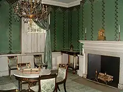 The 1810 United States census shows that seven people lived in the Jumel household, but the Jumels probably split their time between the uptown mansion and their Lower Manhattan house.[121] The Jumels remodeled the house, adding the Federal style entrance[2][122] and redecorating the interior in the Empire style.[23][123] The family reproduced the original wallpaper and bought as much furniture as they could.[117][122] Stephen Jumel publicly described the renovation as a gift to his wife in an attempt to increase her standing in society.[119] He also bought up several neighboring farms.[124] The family sometimes stayed in their other houses in Lower Manhattan and France.[125] Mary Bowen refused to stay in the mansion by herself because of a belief that the house was haunted by the ghosts of soldiers.[126] The Jumels hosted numerous prominent European and American guests at their mansion.[95][127][128][h] By 1814, Stephen Jumel had offered the mansion and his other properties for sale, but the mansion was not sold.[114]