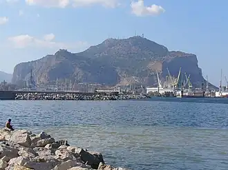 Mount Pellegrino (Italian: Monte Pellegrino; Sicilian: Munti Piddirinu) is an isolated carbonate rock promontory on the northern coast of Palermo, Sicily, Southern Italy. It has an altitude of 606 meters (1,988 ft) above sea level, making it the highest peak within the city perimeter; however, due to its low height it is generally compared to a hill. It extends towards the Tyrrhenian Sea, closes the Gulf of Palermo to the north, and marks the eastern border of the bay of Mondello. Being visible from all the areas on which the city stands, the promontory is one of its most represented symbols.[1] In 1992, Mount Pellegrino been identified as a Special Area of Conservation by the European Commission[2] due to the fossil finds, the presence of a notable endemism,[3] and the historical finds, which include the Paleolithic graffiti of the Addaura cave, one of the few finds of rock art in the Mediterranean area. From 1996, it is the heart of the natural reserve of the same name, which extends for 1,050 hectares (2594,607 acres).