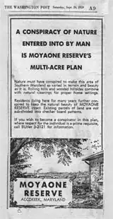 The Moyaone Reserve's approach to conservation was described by Maryland Republican Senator John Marshall Butler as "an almost unique or pilot project in cooperative individual activity for the development and use of the countryside without destroying its natural attraction."[7] This operated by purchasing land, subdividing it, placing restrictive covenants on it via conservation easements, and then reselling the land.[7][8] Robert Straus, one of the founders of the Moyaone Association, described it as "zoning on a do-it-yourself basis." For a period of time, the Accokeek Foundation held the conservation easements before they could be transferred to the federal government in the early 1970s.[15]