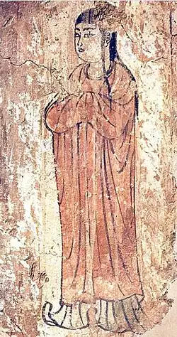 The female figure on the right is dressed in banbi and ruqun, the traditional Chinese attires which consist of a short, long-sleeved green jacket, reaching only to the middle of the upper part of the body, and a long skirt, which covers the feet; a brown cloak or scarf covered, slightly thrown over the right half of the body from the shoulder to about half of the thigh, and the left shoulder to the chest. She wears green shoes with turned-up toes. The dense, black hair is folded at the apex to a spherical structure. The three worshippers may be compared with the figures of Uyghur princes and princesses holding flowers in the cave paintings at Bezeklik.