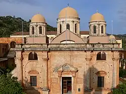 The church is built in the Byzantine architectural cruciform style with three domes. The main church is flanked by two smaller domed chapels, one of which is dedicated to the Life-Giving Spring (Zoodochos Pigi) and the other to Saint John the Theologian.[4] The main church is dedicated to the Holy Trinity and the church has a narthex at the front set at right angles to the main aisle. There are two large Doric-style columns and one smaller, Corinthian-style column on either side of the main entrance. The facade of the church has double columns of Ionian and Corinthian style and bears an inscription in Greek, which is dated to 1631.[4] The monastery's cellar door is dated to 1613. In the 19th century the monastery was established as an important theological school from 1833,[1] and the belfry is dated to 1864.[4] The monastery was later extensively damaged during conflicts with the Turks and in 1892, a seminary was established.[4]