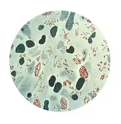 Mycobacterium leprae is an intracellular, pleomorphic, non-sporing, non-motile, acid-fast, pathogenic bacterium.[3] It is an aerobic bacillus (rod-shaped bacterium) with parallel sides and round ends, surrounded by the characteristic waxy coating of mycolic acid unique to mycobacteria. It is Gram-positive by Gram staining, but Mycobacterium leprae was traditionally stained with carbol fuchsin in the Ziehl–Neelsen stain. Because the bacilli are less acid-fast than Mycobacterium tuberculosis (MTB), the Fite-Faraco staining method, which has a lower acid concentration, is used now.[9][10] In size and shape, it closely resembles MTB. The bacteria are found in the granulomatous lesions and are especially numerous in the nodules. This bacteria often occur in large numbers within the lesions of lepromatous leprosy and are usually grouped together as a palisade.[6] By optical microscopy of host cells, Mycobacterium leprae can be found singly or in clumps referred to as "globi", the bacilli can be straight or slightly curved, with a length ranging from 1–8 μm and a diameter of 0.3 μm.[11] The bacteria grow best at 27 to 30 °C, making the skin, nasal mucosa and peripheral nerves primary targets for infection by Mycobacterium leprae.[12]