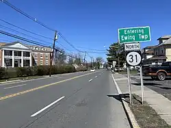 Route 31 heads north from US 1 Bus./US 206 at the Trenton Battle Monument in Trenton, Mercer County, on city-maintained two-lane undivided Pennington Road. The route passes by residences and some businesses in the northern part of Trenton, crossing the intersection with Calhoun Street (CR 653). Route 31 enters Ewing and becomes state-mantainted at the point where it crosses the intersection with Parkway Avenue (County Route 634 [CR 634]).[1][2] The route continues north through suburban residential areas and passes to the west of The College of New Jersey campus.[1][2] It crosses into Hopewell Township and briefly becomes a four-lane divided highway as it intersects I-295. Past this interchange, Route 31 continues north as an undivided road through a mix of residences with some businesses, meeting the intersection with Washington Crossing–Pennington Road/Blackwell Road (CR 546) and Pennington Road (CR 640) at a traffic circle. It continues past the circle as a two-lane, undivided road and bypasses Pennington to the west. The route briefly skirts into Pennington twice, where it is a divided highway as it crosses over CSX's Trenton Subdivision railroad line. Route 31 enters Pennington again before heading back into Hopewell Township. Here, the road meets the intersection with North Main Street (CR 640) and heads north into farmland and woodland with some homes.[1][2] It eventually turns to the northwest and crosses the intersection with Lambertville–Hopewell Road (CR 518).[1]