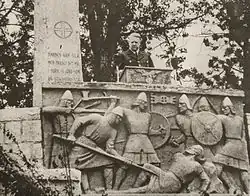 The NS monument, or Nasjonal Samling monument, was a Norwegian 9-metre (30 ft) tall obelisk made from quartzite shale from Vågå Municipality in Norway. It was erected at Stiklestad in Nord-Trøndelag county in July 1944 and inaugurated by collaborationist Minister-President Vidkun Quisling.[1] Since 1934, Quisling's Nasjonal Samling party had held a number of rallies at Stiklestad, in an attempt to link the party to Norway’s historic past.[2] The NS monument took the place of the Olav's monument erected in 1807 in remembrance of Olav Haraldsson, who later became King Olaf II of Norway and received the epithet "Olaf the Holy." The Olav's monument was consequently placed in storage at Verdalsøra.