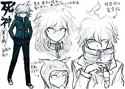 Nagito was created to be "an absolute rival" to Hajime Hinata, with Kazutaka Kodaka describing their relationship as similar to that of the Joker to Batman. Komaeda's characterization was aimed to give players a confusing view in regards to Nagito's true self, based on the morally dubious and contradictory actions he committed over the course of the game.[4] In regards to his design, Hajime was the earliest-designed character which generated a major contrast between his white clothing to Nagito's dark clothing.[5] Nagito was written to create a major impact into the game despite not being the lead or antagonist, symbolizing the prominent themes of hope and despair through his actions.[6]