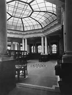 Queensland sandstone, mainly from the Murphy Creek quarries, (specifically selected by Alexander Innes, stonemason and late foreman of the quarries) was used in the construction of the building. New Zealand Oamaru limestone was imported for the Corinthian columns of the Queen and Creek Streets frontages. The mantle pieces and the marble for the entrance hall were purchased by Lt-Colonel Edward Robert Drury, the bank's general manager, while he was in the United Kingdom during 1883–84. The upper floors provided a lavish suite for the manager, while the lower floors accommodated banking chambers and offices. Drury also selected much of the furniture still extant on the bank's upper floors. A passenger lift was installed in the 1890s and electricity replaced gas for the building lighting around the same time.[1]