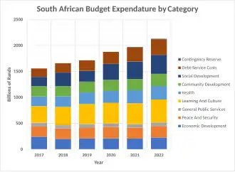 The National Budget of South Africa comprises the spending and revenues of the Government of South Africa .[ 1] [ 2] [ 3] The budget is the financial representation of the priorities of the government,[ 4] [ 5] [ 6] [ 7] [ 8] [ 9] [ 10] [ 11]