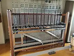 The carillonist sits at a clavier or keyboard and uses his or her hands and feet to strike wooden keys and pedals which are each connected by a wire to a clapper inside a bell. When a key or pedal pulls on the wire, the clapper strikes the bell to create a sound. The bell itself doesn't move. Timothy Hurd stated that "the carillon is a highly gestural instrument. The dexterity required is more one of limbs than of finger skills. It is like dancing to your own music".[6]: 46 For seven years after Gladys Watkins retired in 1936, there was no carillonist: instead, an electric machine played the bells automatically, using a perforated paper roll like those used in a pianola. This machinery was removed in 1986 when the bells and wires were refurbished.[6]: 30, 43