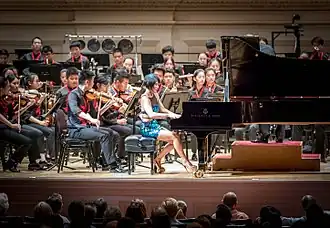 Music Director of the Seattle Symphony Ludovic Morlot joined the orchestra to lead rehearsals during the latter half of the residency. On July 22, the orchestra premiered at Carnegie Hall's 2804-seat Main Hall (Stern Auditorium/Perelman Stage) with Morlot conducting and Yuja Wang performing on piano in a sold-out concert simultaneously streamed to audiences worldwide via Medici.tv.[11] In attendance was the National Youth Orchestra of the United States of America, which itself had performed one day prior on the same stage.[12] The orchestra then embarked on a concert tour of China, performing at the Beijing Concert Hall, the Shanghai Oriental Art Center, and the Suzhou Culture and Arts Centre. Winner of the 11th Van Cliburn International Piano Competition Olga Kern joined the orchestra for its performances in China.[13] As part of their official performance uniform, students adorned specially commissioned vests designed by Chinese couture designer Guo Pei.