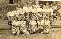 At the request of the Netherlands Information Bureau (NIB), Boissevain-van Lennep travelled to the United States in 1949, visiting 27 states and championing the "Magic Skirts of Reconstruction".[3] Her preferred nickname was "levensrok" (skirt of life) while others in the Netherlands used "bevrijdingsrok" (liberation skirt) or "oranjerok" (orange skirt, referring to the House of Orange, the reigning Dutch royal family).[1] Each had one or more triangles sewn near the front hem on which the date of the Dutch Liberation Day, 5 May 1945, was embroidered; some also had the dates of later celebrations in which the makers participated.[4][5] Prominent among the colours in these feestrok were the Dutch national colours: red, white, blue, and orange.[5] The skirts were individually registered in a national archive under the names of their makers, and their identification number was often embroidered into the skirt itself.[4]