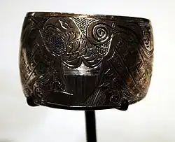 Copper, initially traded from tribes near the Coppermine River in the interior, was worked into jewelry even before European contact.[29] Later, silver and gold became popular materials for jewelry. Bracelets in particular are hammered and then carved with heraldic or mythic designs, and given away at potlatches. Northwest Coast jewelers increasingly use repoussé techniques in metalworking.[30] Charles Edenshaw (Haida, 1839–1920) and Bill Reid (Haida, 1920–1998) were highly influential Northwest Coast jewelers.