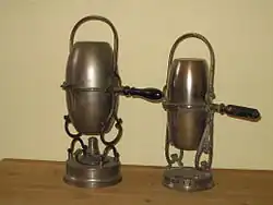 Some of the finely crafted coffee pots manufactured in the late 19th-century work on the same principle, including the Russian reversible pot aka Russian egg, and the reversible Potsdam cafetière aka Potsdam boiler. Another variant was the Arndt'sche Sturzmaschine[5] (not to be confused with the Arndt'sche Caffee-Aufgussmaschine). A spiritus cooker heats the mounted flippable pot.