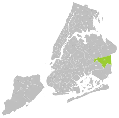 District 27 is based in the predominantly Black neighborhoods of southeastern Queens, including St. Albans, Cambria Heights, and parts of Jamaica, Hollis, Springfield Gardens, and Queens Village.[4]