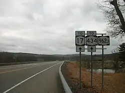 New York State Route 962J (NY 962J) is a 0.41-mile-long (0.66 km) southwest-northeast reference route that, unlike most reference routes, has been signed as a touring route in Southern Tier town of Owego in Tioga County, New York. Its southwestern terminus is at NY 17 and NY 434 in the census-designated place of Apalachin and its northeastern terminus is at NY 17C south of the hamlet of Campville.
