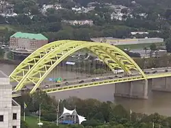 Newport was settled c. 1791 by James Taylor Jr. on land purchased by his father James Sr. from George Muse, who received it as a grant. Taylor's brother, Hubbard Taylor, had been mapping the land twenty years prior.[8] It was not named for its position on the river but for Christopher Newport, the commander of the first ship to reach Jamestown, Virginia, in 1607.[9] Newport was established as a town on December 14, 1795, and incorporated as a city on February 24, 1834.[9] In 1803, the Ft. Washington military post was moved from Cincinnati to become the Newport Barracks. A bridge first connected Newport to Covington in 1853,[10] and the first bridge spanning the Ohio River to Cincinnati, the John A. Roebling Suspension Bridge, opened in 1866. Newport experienced large German immigration in the 1880-90s.[11]