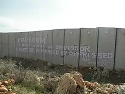 During 2008 and 2009, the residents of Ni'lin and international activists staged weekly demonstrations against a nearby expansion of the Israeli West Bank barrier.[27][28] It has been estimated that the completion of the barrier will remove one third of Ni'lin's land.[29]