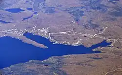 The community of Wahnapitae is located east of Sudbury along Highway 17. Established as a logging community, it was the first settlement in Nickel Centre. The community takes its name from the Wanapitei River, which flows through Wahnapitae, and whose name in turn comes from the Ojibwe word waanabidebiing, which means "concave-tooth [shaped] water" and describes the shape of Lake Wanapitei.[13] The correct spelling of the community's name should not be confused with the correct spelling for the water bodies. During early stages of the town's development, the river was used by multiple companies to send harvest logs to Southern Ontario for processing. After mining became more viable in the Sudbury District, logging operations in Wahnapitae were stopped, leaving the town as a residential community.