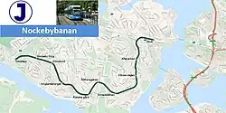 Nockebybanan (lit. 'the Nockeby Line') is a tram/light-rail line between Nockeby and Alvik in the western suburbs of Stockholm, Sweden. The 5.6 kilometers (3.5 mi) long line is part of the Storstockholms Lokaltrafik public transport network, and connects with the Stockholm metro and Tvärbanan tram at Alvik metro station. The Nockebybanan, also known as line 12, is operated by Stockholms Spårvägar.
