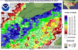 The North American blizzard of 2008 was a winter storm that struck most of southern and eastern North America from March 6 to March 10, 2008. The storm was most notable for a major winter storm event from Arkansas to Quebec. It also produced severe weather across the east coast of the United States with heavy rain, damaging winds and tornadoes, causing locally significant damage. The hardest hit areas by the wintry weather were from the Ohio Valley to southern Quebec where up to a half a meter of snow fell locally including the major cities of Columbus, Ohio, Cleveland, Ohio, and Ottawa, Ontario. For many areas across portions of the central United States, Ontario and Quebec, it was the worst winter storm in the past several years.[4] The blizzard and its aftermath caused at least 17 deaths across four US states and three Canadian provinces, while hundreds others were injured mostly in weather-related accidents and tornadoes.