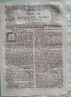 The first issue of Notizie del mondo of Venice was published on 28 November 1778.[4] It stated it was a reprint, with additions, of the newspaper with the same name published in Florence since 1768. Notizie del mondo of Venice had initially on its first page two dates, the date of Florence and the actual date of printing in Venice. The content was, however, completely independent from the Florence newspaper. From the first number of 1779, the Venetian Notizie del mondo left the graphic design of the Florentine Notizie del mondo. From the first number of 1785, the double dates were no longe used and, from issue 85 of the same year, the indication of being a reprint disappeared.[4]