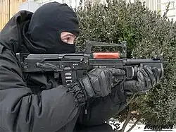 The OTs-14 "Groza" uses the internal mechanism of the AKS-74U, but in a bullpup configuration and chambered for 9×39 SP-6 subsonic ammunition.[3] The trigger and pistol grip are part of a modular unit that can be swapped with an alternative unit that has an integrated 40 mm grenade launcher. When the grenade launcher unit is attached, the trigger controls both the grenade launcher and the rifle itself. Whether the rifle or grenade launcher barrel will be fired when the trigger is pulled is determined by the selector switch. The grenade launcher can use the same grenades used in the GP-25/GP-30.[14]