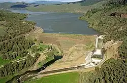 The original 1920 Ochoco Dam was privately built, 126 feet (38 m) high and 1,000 feet (300 m) long. Chronic leaking through its middle section posed a constant threat to the city of Prineville, close downstream, so the dam was replaced by the United States Bureau of Reclamation in 1949.[3] The 1949 reconstruction brought the earthen dam to 152 feet (46 m) high. In the mid 1990s the reservoir was drained twice for additional safety retrofitting. Although the Bureau of Reclamation has been involved in much of the work here, title to the dam is held by the Ochoco Irrigation District.[4]