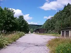 This halt was located on Czechoslovak territory (50°38′23″N 13°23′42″E / 50.639835°N 13.394925°E) and was only opened on 15 June 1928, one year after the opening of the line. The small, single-storey, half-timbered station building had a waiting room, an office, and rooms for the Czechoslovak border and customs officials. Signs were bilingual during the existence of the First Czechoslovak Republic and after World War II. Due to the changed political situation after 1945, the station was not served any more from 1945 on. The buildings were demolished around 1970.