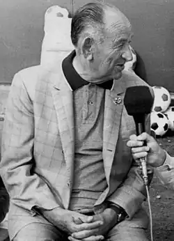 Shortly before the end of the 1966–67 season, a military coup d'état took place and the Colonels seized power in Greece, establishing a dictatorship. The regime of the Colonels had devastating consequences for Olympiacos.[3] In December 1967, Giorgos Andrianopoulos, club legend and president of the club for 13 years (1954–1967) was forced out of the club's presidency by the military regime.[59] Furthermore, the regime cancelled the transfer of Giorgos Koudas to Olympiacos[60] and days later another blow was delivered to the club: Márton Bukovi, already a legend and architect of the great 1965–67 team, was forced out of Greece by the military junta, being labelled a communist.[61][62] He left Greece on 21 December 1967, along with Mihály Lantos.[63]