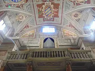 Also conserved are the seventeenth-century frescoes depicting the Life of Saint Francis Xavier, located in the atrium and executed by various artists on a design by Lazzaro Baldi (1624-1703),[5] while the main altarpiece dating from the eighteenth century is by Sebastiano Conca and depicts the Holy Trinity and Saint Francis Xavier.[11][12][13]