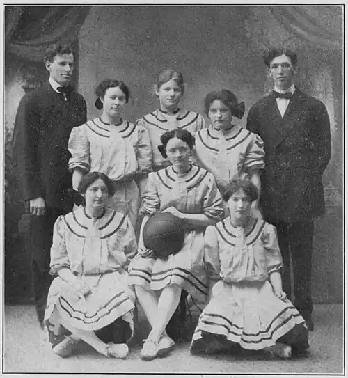 A women's basketball team was established at Oregon Agricultural College during the academic year of 1897–98, with one game played in the spring of 1898 by the school squad in response to a challenge offered by the team of the Chemawa Indian Institute of Salem.[4] The match, played April 29 in Salem at the Willamette University gym, was won by OAC by a score of 13 to 11.[5] The OAC team included Inez Fuller, Fanny Getty, Dora Hodgin, Blanche Holden, Bessie Smith, and Leona "Nonie" Smith.[5]