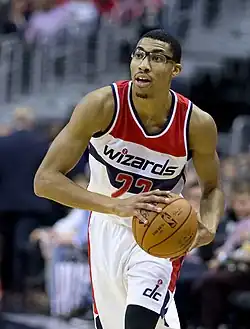 Porter was selected with the third overall pick in the 2013 NBA draft by the Washington Wizards.[5] However, he missed training camp and the first 18 games of the 2013–14 season with a hip injury. He made his NBA debut on December 6, going scoreless in 14 minutes in a 109–105 overtime loss to the Milwaukee Bucks.[6] He twice scored a season-high nine points in April 2014.[7] On November 1, 2014, he scored 19 of his career-high 21 points in the second half of the Wizards' 108–97 win over the Bucks.[8] On November 7, 2015, he set a new career high with 23 points in a 114–99 loss to the Atlanta Hawks.[9] On December 12, 2015, he scored a career-high 28 points in a 114–111 win over the Dallas Mavericks.[10]