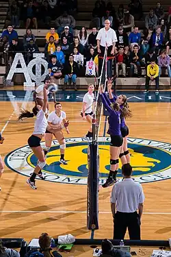 The Tigers women's volleyball team in action against the Texas A&M–Commerce Lions in 2013