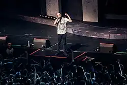 In reaction to the 2022 Russian invasion of Ukraine, Oxxxymiron called for an anti-war movement, stating, "I know that most people in Russia are against this war, and I am confident that the more people would talk about their real attitude to it, the faster we can stop this horror." He cancelled six sold-out concerts in Moscow and St. Petersburg, stating, "I cannot entertain you when Russian missiles are falling on Ukraine. When residents of Kyiv are forced to hide in basements and in the metro, while people are dying."[15] He later said that it was impossible to hold an anti-war concert in Russia because "total censorship has been implemented, and anyone who speaks out against the war in any way becomes a potential target for criminal prosecution."[16] He went on to announce a series of benefit concerts in other countries, entitled "Russians Against War", the proceeds from which would be donated to NGOs helping Ukrainian refugees. The first of these concerts was held in Istanbul, which has a large Russian diaspora consisting of people who left the country in protest of the invasion.[17] In September, he returned to Russia; the next month, the Russian justice ministry added him to the list of foreign agents.[18]