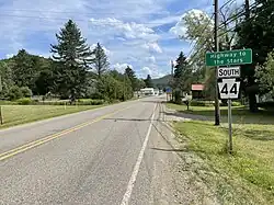 PA 44 runs through hilly areas with a mix of fields and woods, crossing into Hebron Township. The road winds north through rural areas, passing east of Greenman Hill. The route turns northwest and passes through the community of Hebron Center, continuing through wooded areas with some farm fields and residences. PA 44 reaches an intersection with the western terminus of PA 244 in the community of Coneville and turns to the west, heading to the south of Oswayo Creek. The road continues through rural areas alongside the creek and passes through the northeast corner of Clara Township before it enters Sharon Township. The route crosses the Oswayo Creek and heads through the community of Millport as it runs through more fields and woods with some development, passing through Sharon Center. PA 44 continues northwest and enters the borough of Shinglehouse, where the name becomes South Stevens Street and it runs through residential areas with some businesses, passing to the northeast of Oswayo Valley High School. The route curves north before it turns west onto Academy Street, heading past homes before passing businesses in the center of Shinglehouse and bending southwest. PA 44 heads into residential areas, turning northwest onto Oswayo Street and west-southwest onto Ceres Street. The road crosses Oswayo Creek and makes a curve to the northwest.[4][10] The route enters Ceres Township in McKean County and becomes Ceres Road, heading northwest through fields and development before running through wooded areas, with the creek to the northeast. The road continues through a mix of farm fields and wooded areas with some development, passing through the community of Myrtle. Farther northwest, PA 44 reaches the community of Ceres and crosses the Oswayo Creek before coming to its northern terminus at the New York border. From here, the road continues north for less than 100 yards (91 m) to a T-intersection with NY 417.[4][12]