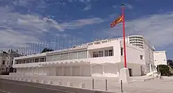 The first cinema exhibition was held on the terrace of the Hotel Excelsior on August 6, 1932. But, with the growing success, it became necessary to build a proper and prestigious venue; this took place between 1936 and 1937, based on a project by the engineer Luigi Quagliata, faithful to the dictates of modernism. The Casino was built in the same area, based on a project by the Chief Engineer of the Municipality, Eugenio Miozzi, who also took care of the layout of the entire area where the Austrian Fort of the Quattro Fontane stood. The urban plan envisaged the symmetrical construction of three buildings in the rationalist style, with the Casino in the center, the cinema building on the left and a third mirror building on the right, intended to house an ice skating rink, which was not built due to the onset of the Second World War. The Palazzo del Cinema, inaugurated on 10 August 1937 for the fifth edition of the Exhibition was then made up of a simple hall and a thousand-seat cinema hall (the present Great Hall). Following the continuous success of the festival, it became necessary to expand the building, which was entrusted to Quagliata himself in 1952. The overall project included the expansion of the Great Hall, an open arena, other cinemas, offices and services.; but only the forepart and the uncovered arena were built.