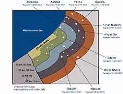 Range of missiles launched from Gaza Strip (10-160 km).