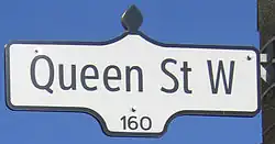 Queen Street, known as Lot Street until 1844, was named in honour of Queen Victoria, who reigned from 1837 until her death in 1901. For a time, Lot Street served as the northern limit of York. On the north side of the street, large 80-hectare (200-acre) park lots were granted to loyalists and government officials, many of whom never visited Upper Canada during their lives.[21] The central portion of Lot Street was constructed as the baseline for surveys along Yonge Street by the Queen's Rangers in 1793 as the first concession road. It was later extended west to Ossington Avenue as part of the Governor's Road (Dundas Street).[22]